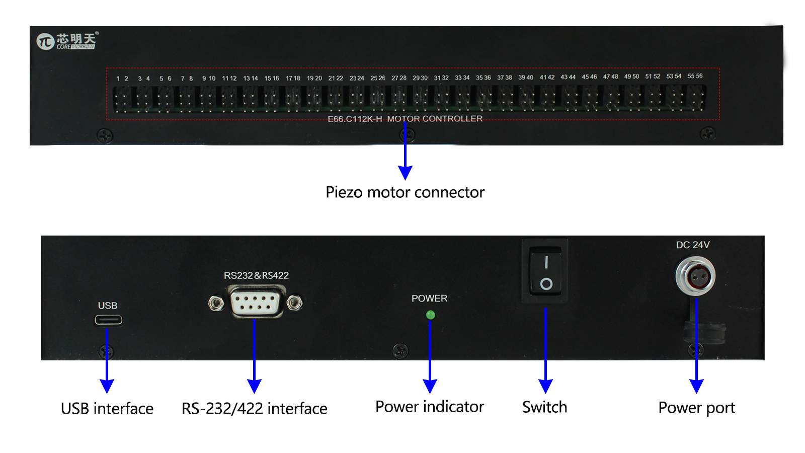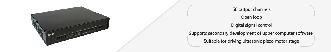 E66.C112K-H is a multi-channel piezo motor controller with 56 output channels, suitable for driving the N59 and N69 series ultrasonic piezo motor stage developed and produced by CoreMorrow. E66.C112K-H can simultaneously connect to 56 ultrasonic piezo motor stages, and can achieve single channel control, multi-channel random control, and multi-channel fixed channel control through the upper computer software. The rear panel has a USB port and RS-232/422 communication interface, which can achieve real-time communication with the upper computer and support secondary development of upper computer software. It has a compact size of 245×45.5×195mm^3, suitable for driving piezo motors in space-limited environments.