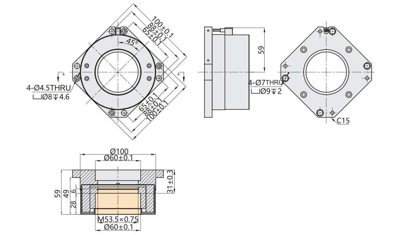 The P76F is a Z-direction piezo objective scanner with a maximum displacement of 90μm and a load capacity up to 900g, making it suitable for high load applications such as laser invisible cutting of wafer. The objective lens connector has various adapters thread to choose, and is customizable according to customer needs. It can be fixed through two different aperture through holes. It adopts flexible hinge mechanism, with no friction, good linearity and high positioning accuracy.