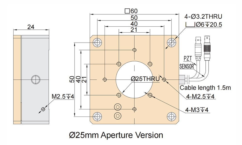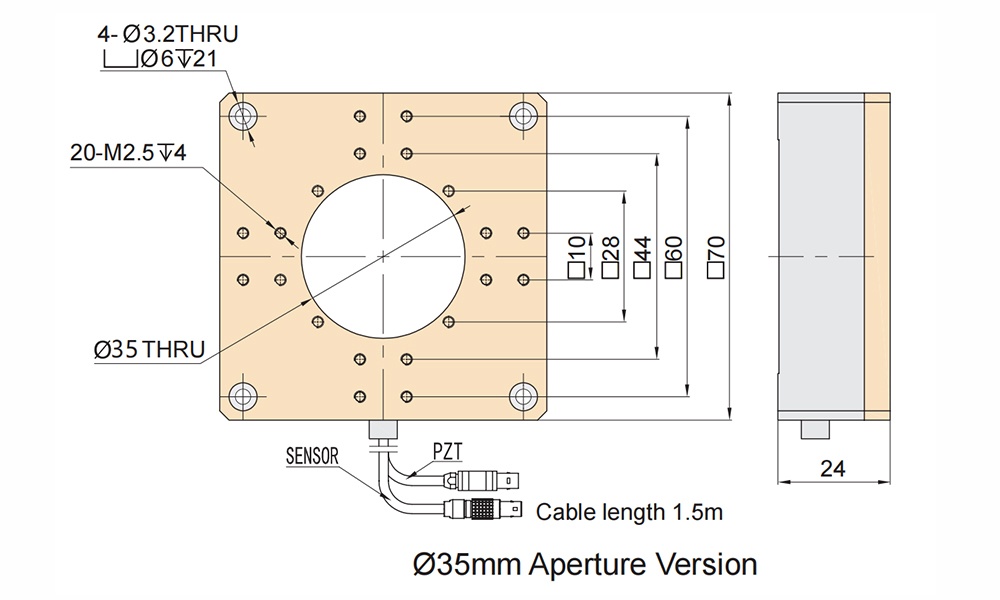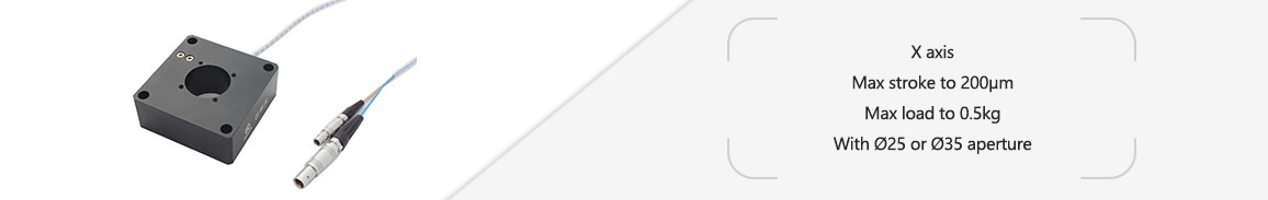 P12.X100 is X-axis scanning stage. The aperture diameter could be selected as 25mm(35mm is optional), which is suitable for applications such as microscopy. The piezo scanner could realize single-axis displacement of 200μm. Integrated structure makes multi-dimensional motion uncoupled and could be selected in various specifications to meet the needs of different applications.