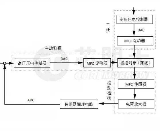 将一组或多组MFC压电纤维片粘贴于薄板两面,在每组中,其中1个或多个MFC纤维片作为促动器,通过芯明天高压压电控制器对其施加电压,建立促动器作用下悬臂梁振动的模态运动;再由1个或多个MFC压电纤维片作为传感器,感应悬臂的振动,在有振动存在时,MFC传感器输出电荷,再由电荷放大器SmartCharge将电荷进行敏感放大输出;在感知悬臂振动时,再由高压压电控制器对另1个或多个MFC施加电压,MFC作为促动器,产生与悬臂振动反向的运动,以抵消悬臂的振动。