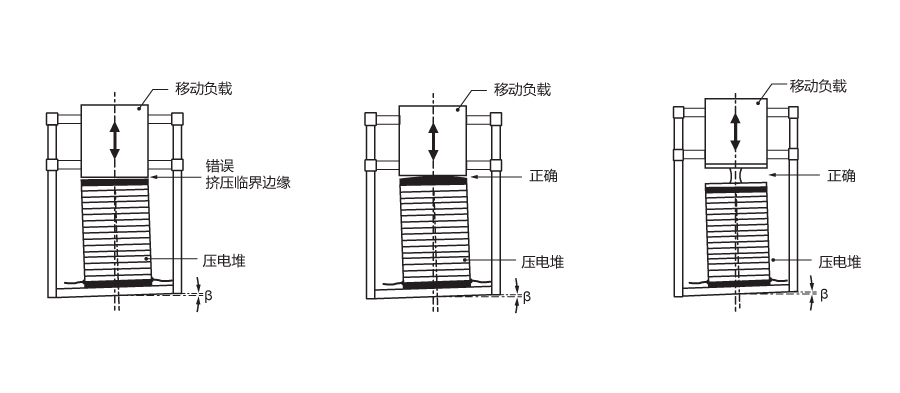 六、压电陶瓷不能承受剪切力、侧向力以及扭转力,加载于陶瓷移动端的力尽量作用于陶瓷运动方向的中心,压电陶瓷的四周尽量保持不受夹持力。