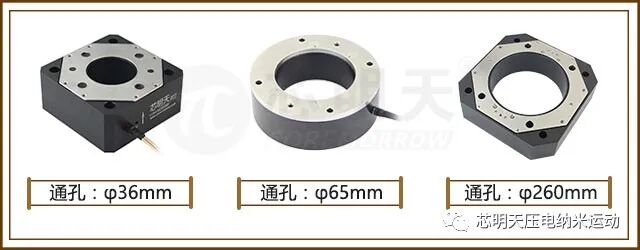 大口径干涉仪一般负载的镜片较大、且要求中心通孔较大,对于这种应用需求,芯明天可根据干涉仪结构,定制设计PZT压电移相器,例如P77系列压电移相器,它的承载能力在正立放置时可达15kg、卧式时5kg、倒置时10kg,并且中心通光孔径从φ36至φ260mm任意选择,并且可定制更大孔径、更大承载。目前标品的行程有6μm、20μm、50μm等。