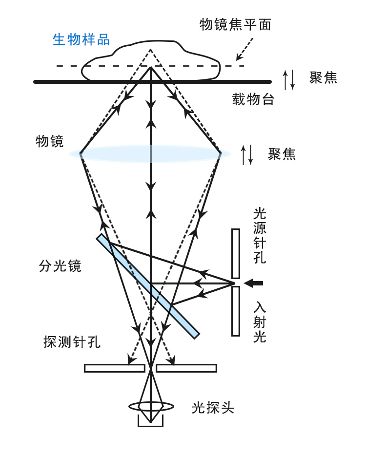 传统荧光显微镜使用荧光物质标记细胞中的特定结构,图像与背景的对比度增强,光源使用了短波长的紫外光,大大提高了分辨率。但当所观察的荧光标本稍厚时,传统荧光显微镜一个难以克服的缺点就表现出来:焦平面以外的荧光结构模糊、发虚。原因是大多数生物学标本是层次区别的重叠结构,在普通光学显微镜下聚焦平面的变化,会表现出不同的形态。假若荧光标记的结构在不同层次上都有分布,且重叠在一起,反射荧光显微镜不仅从焦平面上收集光量,而且来自焦平面上方或下方的散射荧光也被物镜所接收,荧光显微镜的光学分辨率因此大大降低。