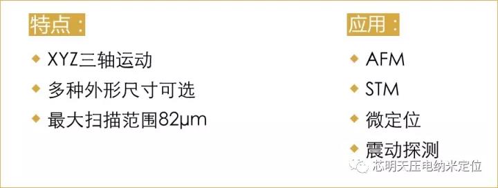 压电陶瓷管扫描器是将压电陶瓷管进行90°四区域电极分割,再分别驱动控制每区域从而实现压电陶瓷管的X、Y、Z轴致动扫描,X、Y轴扫描范围可达82μm,Z轴扫描范围可达15μm。