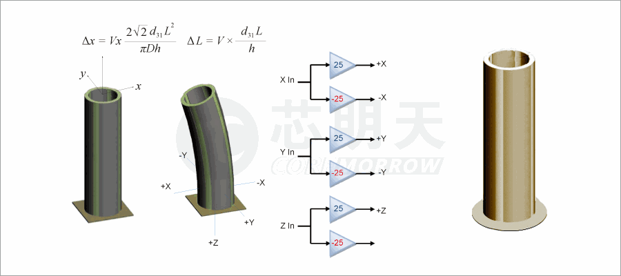 压电陶瓷剪切片是利用压电陶瓷切向d15剪切致动的压电陶瓷,可以通过剪切片叠加组合的方式组成XY轴运动台,再与轴向致动的压电陶瓷组合制成迷你型XYZ三维微动平台。