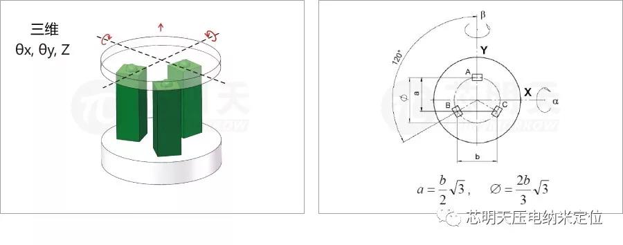内部三支压电陶瓷促动器是由三通道控制器来分别单独驱动以产生俯仰/偏转运动或同时并联驱动以产生直线升降运动。