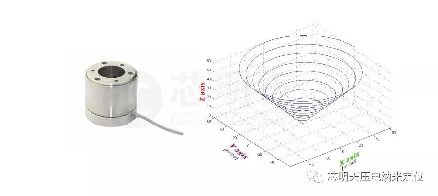 二维θx θy压电偏转镜对光路调整范围为一个圆面,圆面的面积大小取决于压电偏转镜的偏转角度及压电偏转镜与待加工件(或宏动结构)间距离。