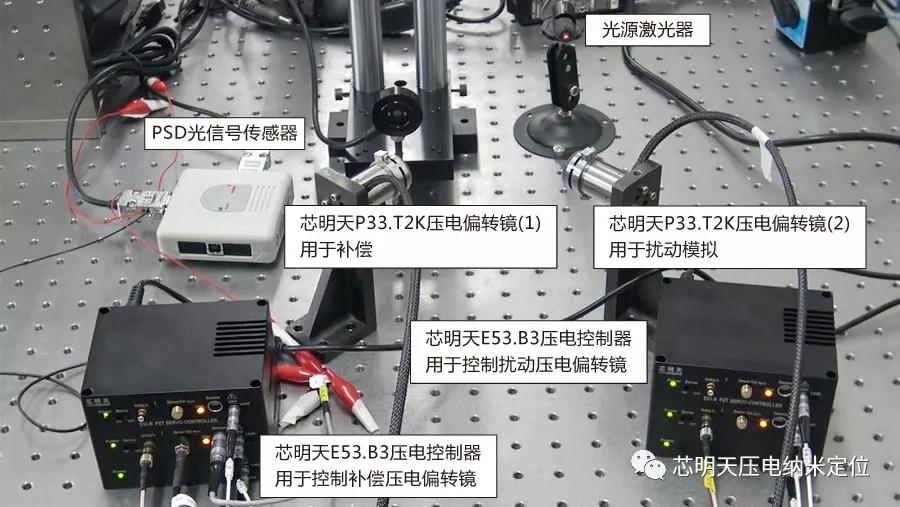 在操作使用前,需要将PSD光信号位置传感器与补偿压电偏转镜控制器进行标定,芯明天E53.B3压电控制器具有偏差比较电路。标定好后,启动干扰用压电偏转镜的控制器,驱动干扰压电偏转镜,产生模拟干扰信号(信号频率、幅度、波形可调)。PSD光信号位置传感器将接收到的光位置信号反馈到补偿用压电偏转镜控制器,通过其内部偏差比较电路,输出补偿所需的电压信号,驱动补偿压电偏转镜进行与干扰信号相同但相反的角度调整。