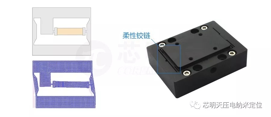 通常柔性铰链反弹和摩擦的影响可以忽略不计,但是在纳米定位要求中却是相当重要而不可忽略。芯明天纳米定位台采用的是柔性铰链机构的弹性形变。下图是芯明天柔性铰链在压电机构中的应用,实现高分辨率以及大位移行程。