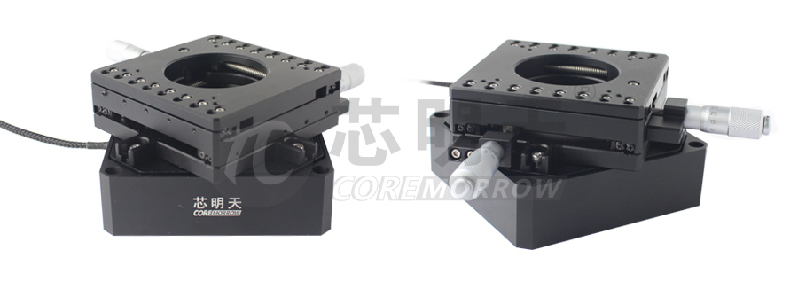 针对该类要求,芯明天提供定制化集成手调平台或电动平台的压电平台,从而既可完成位置的粗调,又可完成纳米级精度的精调。下图所示,为一款定制型宏微复合压电平台,集成手调台的压电平台。