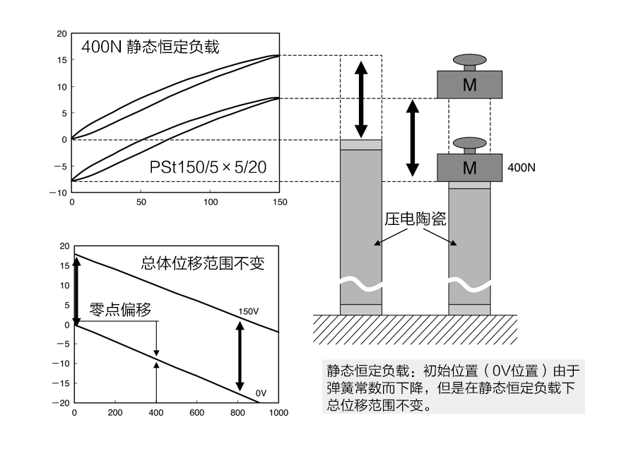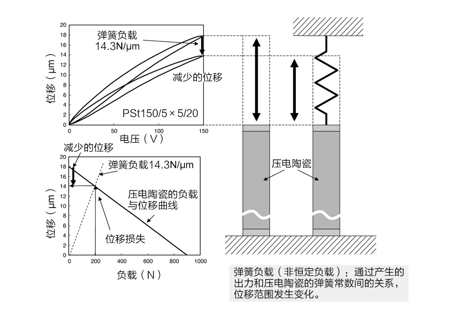 弹簧负载(非恒定负载):由于产生的出力和压电陶瓷的弹簧常数间的关系,位移范围发生变化。