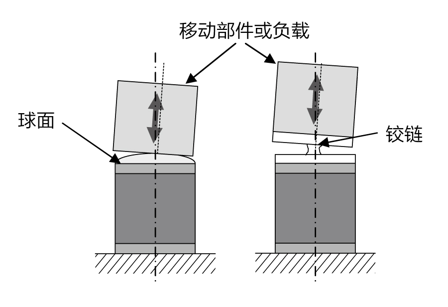 2)正确的安装。如下图所示。安装压电陶瓷时,使负载均匀地施加在球面或铰链上。