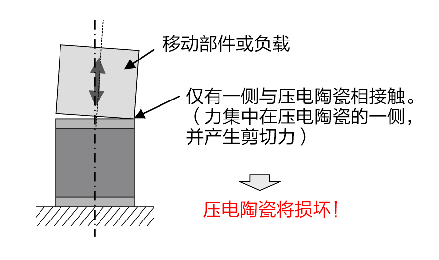 1)错误安装方式。如下图所示。压电陶瓷与负载间没有合适的对齐与接触,压电陶瓷将损坏!