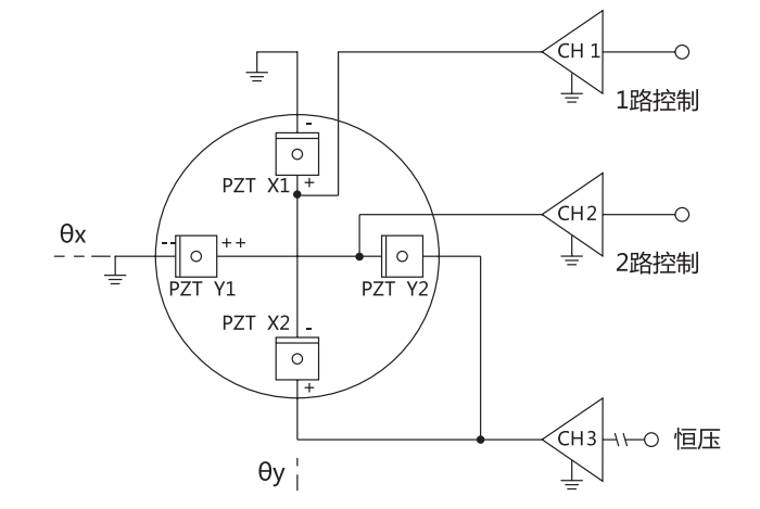 压电偏转镜(两轴运动)是基于平行运动学设计,具有共面轴及移动面。四个执行机构(压电促动器)以90°角平分放置, 成对的差分控制分布。两对差分驱动压电促动器在较大温度范围内提供最高可实现的角度稳定性。它的偏摆运动是由两对压电促动器以推拉模式来实现,采用桥式连接电路控制。
