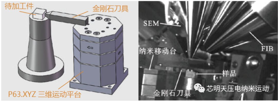 压电纳米定位系统控制刀具缓慢向待加工件表面移动,直至接触,并记录位置,再次移动刀具至加工点,预切削后,再通过压电纳米定位系统控制刀具进行纳米级车削。