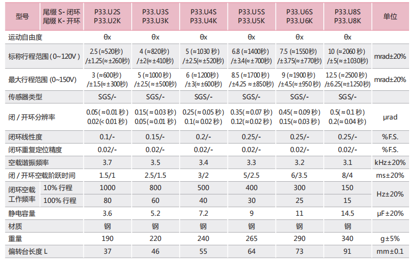 P33.T8S 压电偏转镜带载 50g 负载达满行程的阶跃时间约 40ms。