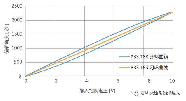P33.T8K 与 P33.T8S 压电偏转镜的电压与偏转角度曲线。