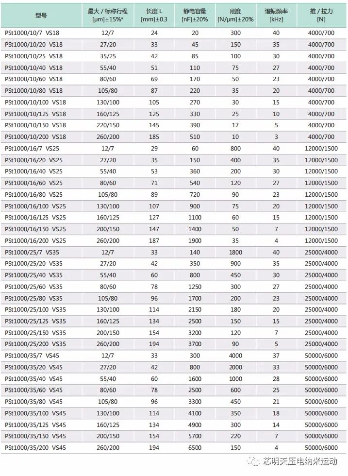 *PSt1000:标称行程是在0~1000V驱动电压下的位移行程,Max.行程范围是在 -200V~1000V,对于高可靠的长期使用,建议驱动电压在0~800V。选择闭环控制,线性度、重复定位精度高。安装预紧力一般不超过出力的20%。