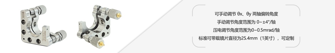 N82K16T25为二维偏转运动型调节架,它是通过2个手动粗调与压电精调相结合的直线压电促动器与镜架组合,实现镜片高精度角度调节。宏动粗调是通过外部壳体上的高精度微细螺纹实现的,手动旋转滚花部分进行宏动调节,宏动部分调节角度可达±4°/轴,且宏动调节配有锁紧螺母,可对宏动调节的位置进行锁定。压电精调部分采用PZT压电陶瓷驱动,对其施加电压以实现微动精调运动,微动调节角度可达0.5mrad/轴(≈103秒)。使用过程中可以通过手动粗调实现大行程调整,再通过压电精调实现纳米级的位移与精度,广泛应用于大行程且高精度的使用场景。