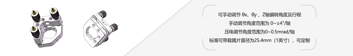 N82K16ZT25为三维偏转运动型调节架,它是通过3个手动粗调与压电精调相结合的直线压电促动器与镜架组合,实现镜片高精度角度调节。宏动粗调是通过外部壳体上的高精度微细螺纹实现的,手动旋转滚花部分进行宏动调节,宏动部分调节角度可达±4°/轴,且宏动调节配有锁紧螺母,可对宏动调节的位置进行锁定。压电精调部分采用PZT压电陶瓷驱动,对其施加电压以实现微动精调运动,微动调节角度可达0.5mrad/轴(≈103秒)。使用过程中可以通过手动粗调实现大行程调整,再通过压电精调实现纳米级的位移与精度,广泛应用于大行程且高精度的使用场景。