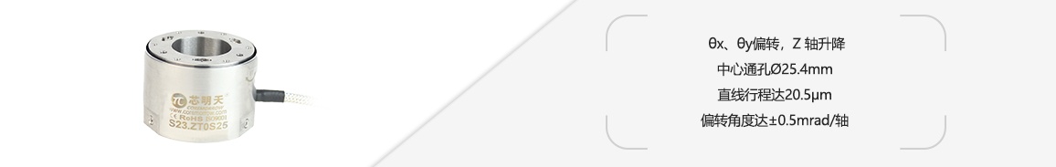 S23.ZT0S/K25系列小体积压电快反镜/偏转镜为θx、θy偏摆及Z轴运动的偏转镜,其体积为Ø49×34mm,可以实现θx、θy轴±0.5mrad/轴的偏转,Z轴20.5μm的直线行程。开环版本具有非常高的分辨率及亚毫秒的响应速度,台体中心带有Ø25.4mm通孔,适用于透光应用,如光过滤等。