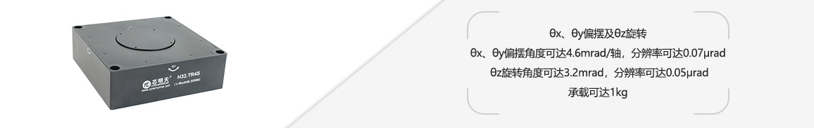 H32系列压电偏摆台,可实现θx、θy偏摆及θz旋转。其内部采用无摩擦柔性铰链结构设计,响应速度快、闭环定位精度高。其体积为155×155×50.5mm^3,水平安装负载可达1kg,可作为振动台用于模拟振动环境,完成精密装备的控制精度测试分析。