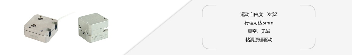N18系列直线压电马达位移台采用粘滑原理,可将PZT压电陶瓷的微运动转换为毫米级长行程。该马达位移台共有N18.X和N18.Z两个规格型号可选,均可实现5mm直线位移。其台体材料为钛,可应用于低温真空无磁环境。