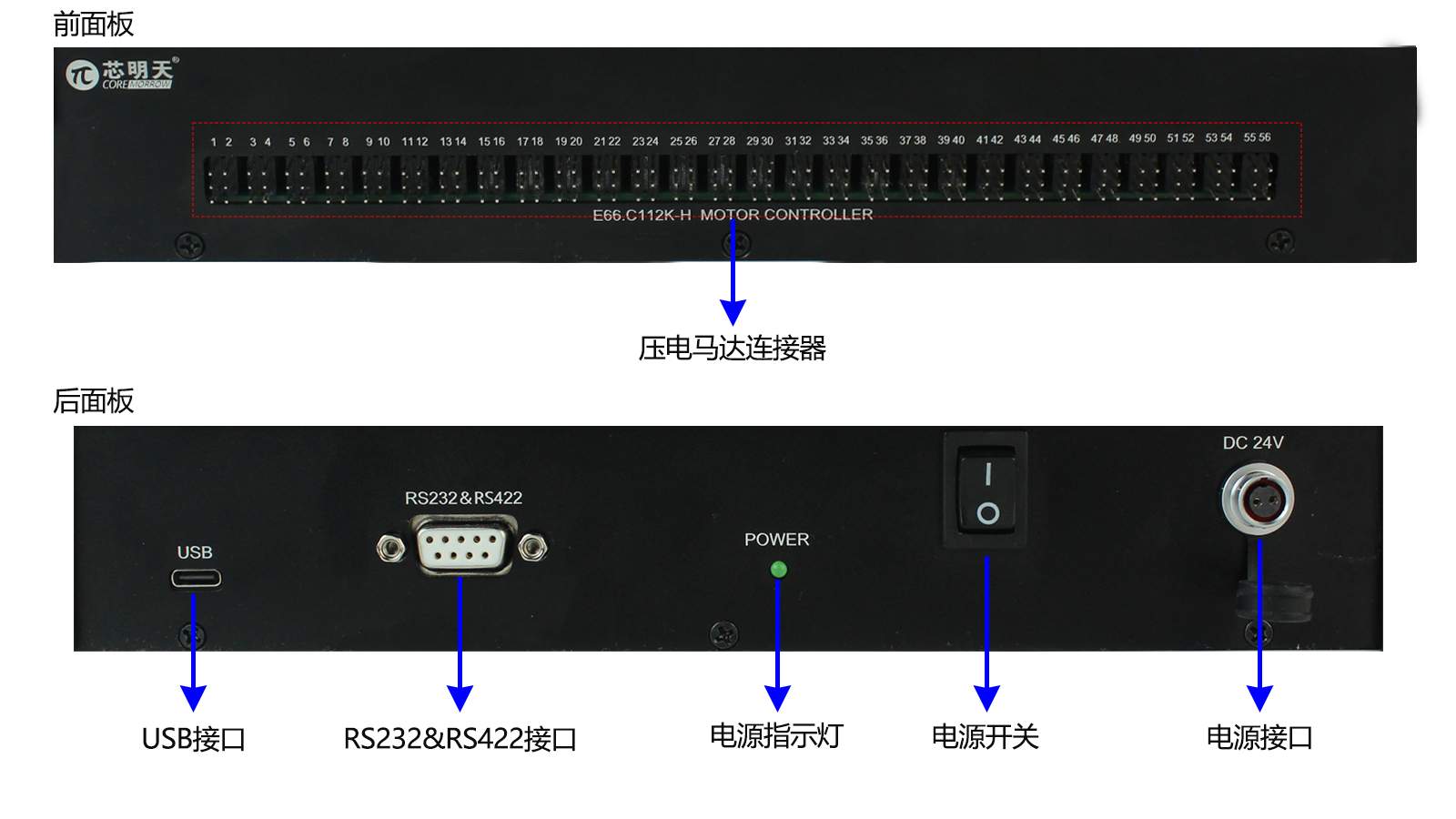 E66.C112K-H是具有56个输出通道的多通道压电马达控制器,适用于驱动芯明天研发生产的N59、N69系列超声压电马达位移台。E66.C112K-H可同时连接56台超声压电马达位移台,通过上位机软件可实现单路控制、多路随机控制、多路固定通道控制。其后面板具有USB口和RS-232/422通信接口,可实现与上位机实时通信,并支持上位机软件二次开发。其尺寸为245×45.5×195mm^3,适用于空间有限的环境中使用。