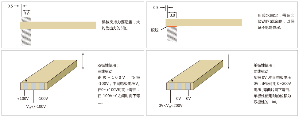 当受到力或温度变化时,请注意压电致动器将产生电荷(即电压),因此在使用前必须通过电阻器正确放电。建议在运输和储存期间保持较大的组件短路。