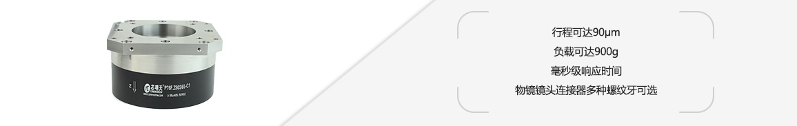P76F系列Z向大负载压电物镜定位器的位移可达90μm,负载可达900g,适合晶圆激光隐形切割等大负载应用。它与物镜镜头连接的适配器具有多种螺纹牙选,也可根据客户需求定制。它的固定可通过两种不同孔径通孔进行固定。采用柔性铰链设计机构,无摩擦,直线性好,闭环型号定位精度高。