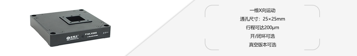 P18A.X200系列压电纳米定位台采用机构放大设计原理,柔性铰链连接支撑传动,内部采用高可靠性压电陶瓷驱动,在X轴可实现达200μm的位移,可配置闭环传感实现高精度扫描与定位。压电平台具有25mm×25mm的通孔,适用于光学扫描。平台可以通过叠加转接的方式实现二维、三维运动。