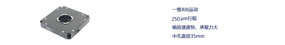 P18.X200 压电纳米定位台为 1 维直线扫描台。台体采用机构放大设计原理,内置高可靠性压电陶瓷,可以实现 250μm的高速扫描,通光孔径为 Ø35mm,多种位移行程及规格型号可供选择,适用于大行程多维扫描等应用。