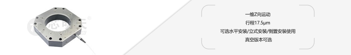 P77.S/K106 大负载压电纳米定位台/移相器为一维Z轴运动平台,压电平台中心为106mm大通光孔,压电陶瓷直驱机构,内置高性能压电陶瓷,可以实现Z轴17.5μm的位移行程,无摩擦柔性导向机构具有高的分辨率,闭环版本定位精度可达纳米级,是光学移相器。