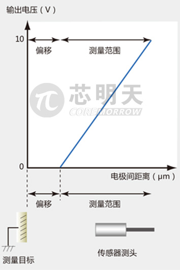 当传感器探头和测量目标之间的距离为一定距离时,传感器输出为零。 距离称为“偏移”。根据偏移距离设置测量范围。偏移通常相当于测量范围的5〜10%,可以选择的测量范围根据测量探头的外径而有所不同,传感器位移分辨率通过以下公式计算: